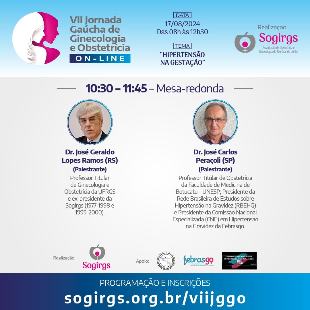 A Sogirgs promoverá com o apoio da Comissão Nacional de Especialidades (CNE) de Hipertensão da Febrasgo e da Rede Brasileira de Estudos Sobre Hipertensão na Gravidez (RBEHG) a “VII Jornada Gaúcha de Ginecologia e Obstetrícia On-line”, no dia 17 de agosto, às 8h.