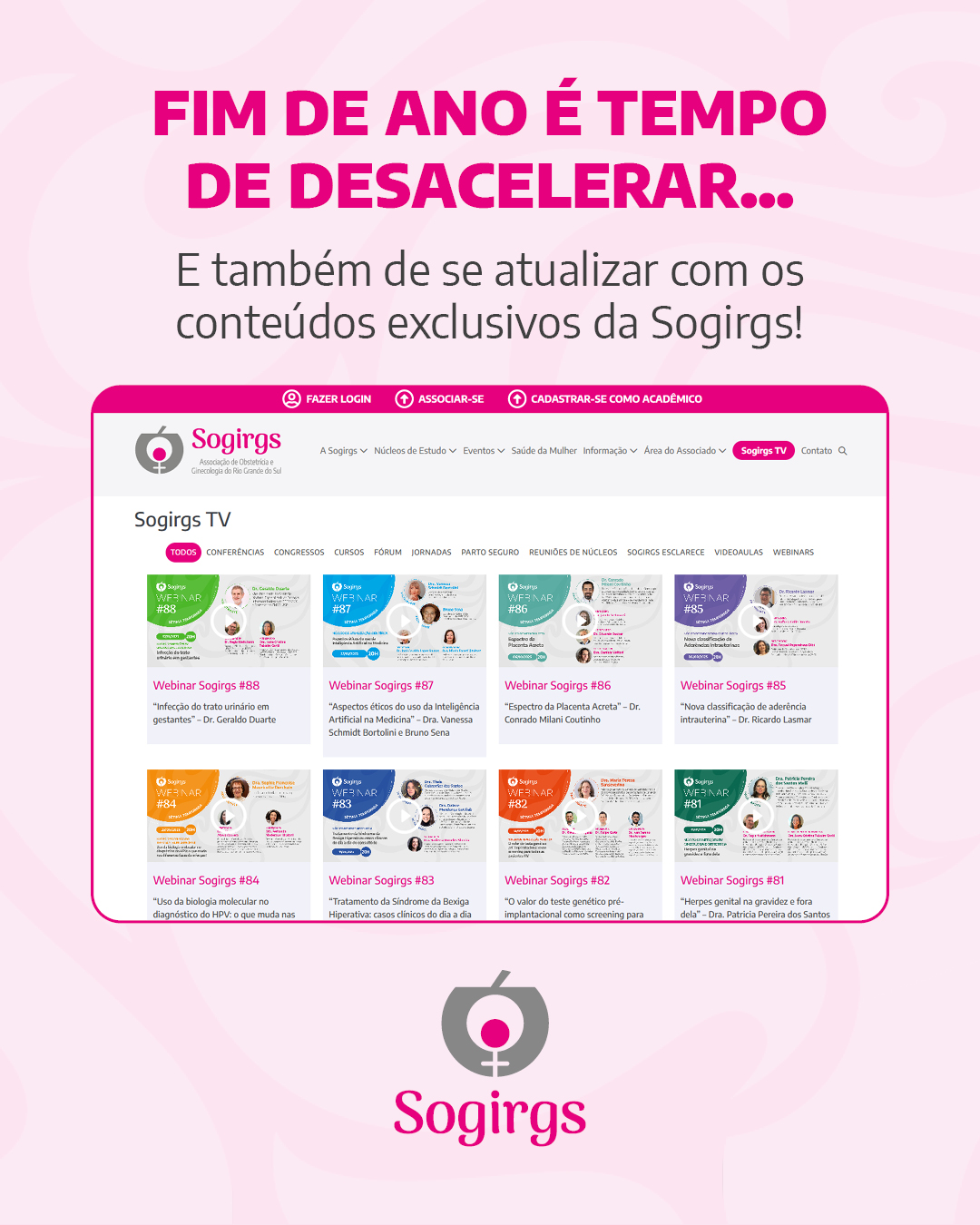 Na área do Associado, você pode conferir artigos científicos, protocolos da Febrasgo, protocolos gerais, notícias Up to Date… E o melhor: você tem acesso ilimitado à Sogirgs TV, onde você pode assistir (e reassistir) todos os nossos webinars!