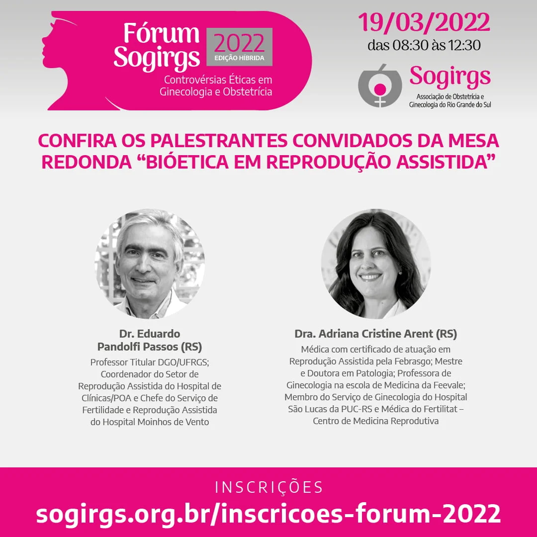 A segunda parte do Fórum Sogirgs (Edição Híbrida) – “Controvérsias Éticas em Ginecologia e Obstetrícia”, no dia 19/03, das 8h30min às 12h30min, que abordará o tema “Bioética em Reprodução Assistida”, coordenada pela Dra. Helena von Eye Corleta, Membro da Câmara Técnica do CREMERS de Reprodução Assistida.