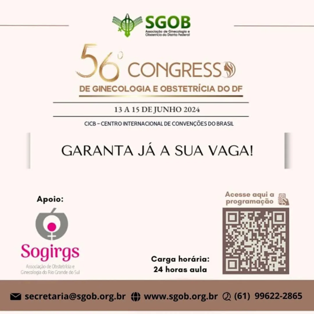 A Sogirgs apoia a realização da 56ª edição do Congresso de Ginecologia e Obstetrícia do Distrito Federal. O evento acontecerá em Brasília, nos dias 13, 14 e 15 de junho de 2024, no Centro Internacional de Convenções do Brasília – CICB.