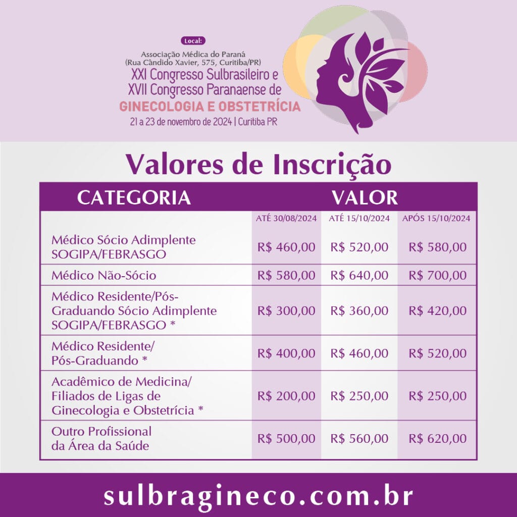 📌 Não perca tempo e garanta já sua inscrição para o XXI Congresso Sulbrasileiro de GO e XVII Congresso Paranaense de GO pelo site sulbragineco.com.br/taxas.asp.
